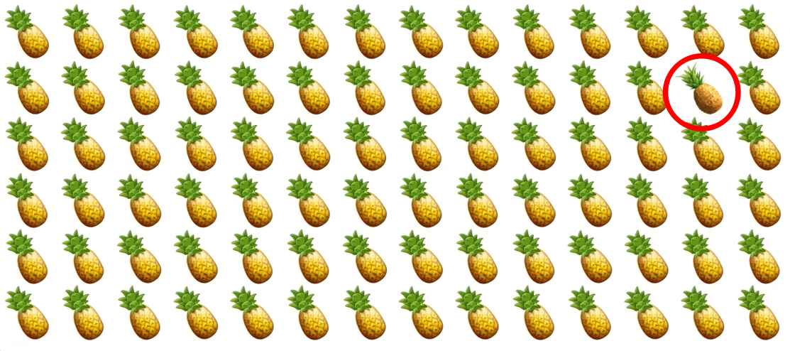 Na obrázku je mnoho ananasů, jsou zobrazeny v několika řadách. Vaším úkolem je najít zvláštní ananas, který se liší od všech ostatních.